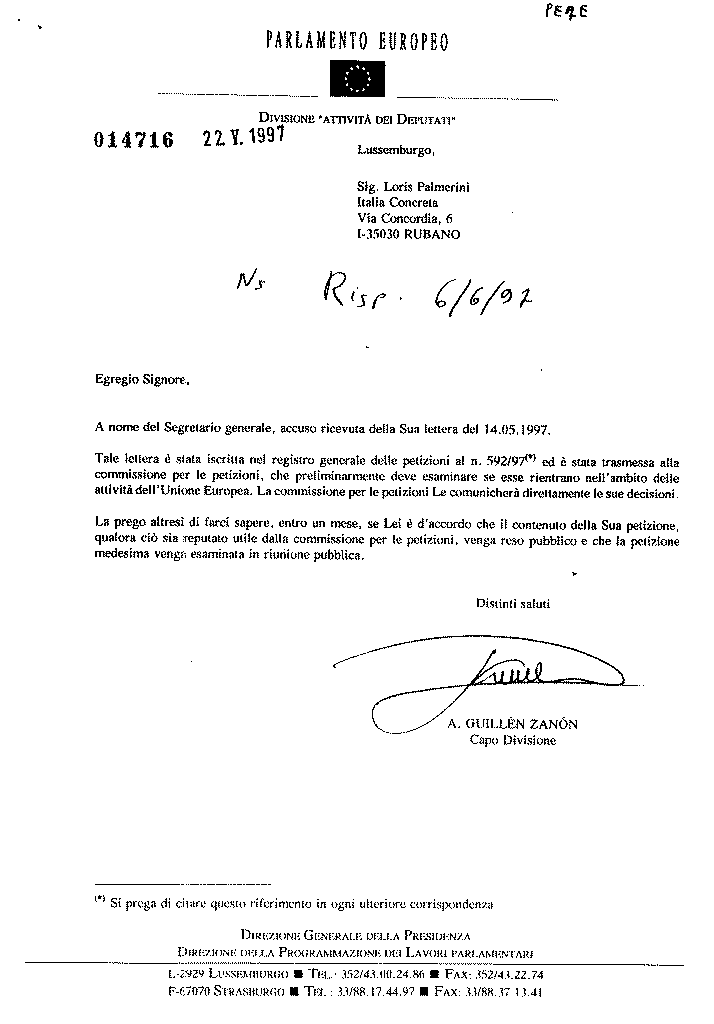 Questa pagina e quelle collegate sono copie di documenti amministrativi miei e di Italia Concreta. La loro lettura è libera a tutela del diritto all'informazione art.10 "Convenzione Europea per la salvaguardia dei diritti dell'uomo" in conseguenza della loro preziosita' democratica ma e' tuttavia da ritenersi confidenziale comunicazione fra persone (giuridicamente umane). Per tanto, ogni documento vale solo per sè stesso e non può essere riferito in alcun modo ad alcun contesto od intenzione e puo' essere divulgato solo se da me espressamente richiesto in personali comunicazioni. La loro lettura implica soggezione alle leggi che tutelano i diritti dell'uomo e non implicano associazione ad alcuna associazione o partito.