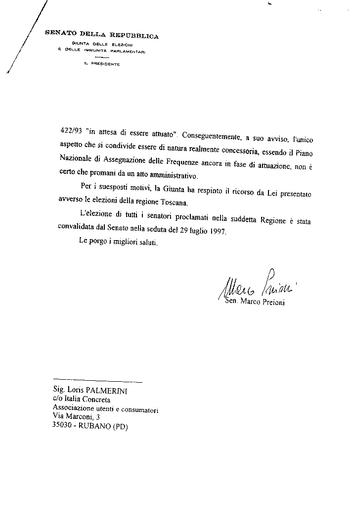 Questa pagina e quelle collegate sono copie di documenti amministrativi miei e di Italia Concreta. La loro lettura è libera a tutela del diritto all'informazione art.10 "Convenzione Europea per la salvaguardia dei diritti dell'uomo" in conseguenza della loro preziosita' democratica ma e' tuttavia da ritenersi confidenziale comunicazione fra persone (giuridicamente umane). Per tanto, ogni documento vale solo per sè stesso e non può essere riferito in alcun modo ad alcun contesto od intenzione e puo' essere divulgato solo se da me espressamente richiesto in personali comunicazioni. La loro lettura implica soggezione alle leggi che tutelano i diritti dell'uomo e non implicano associazione ad alcuna associazione o partito.